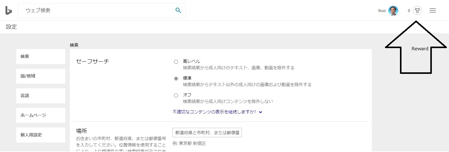 Bingを使っていて上の矢印のところをクリックすると、リワードのページがでてきます。