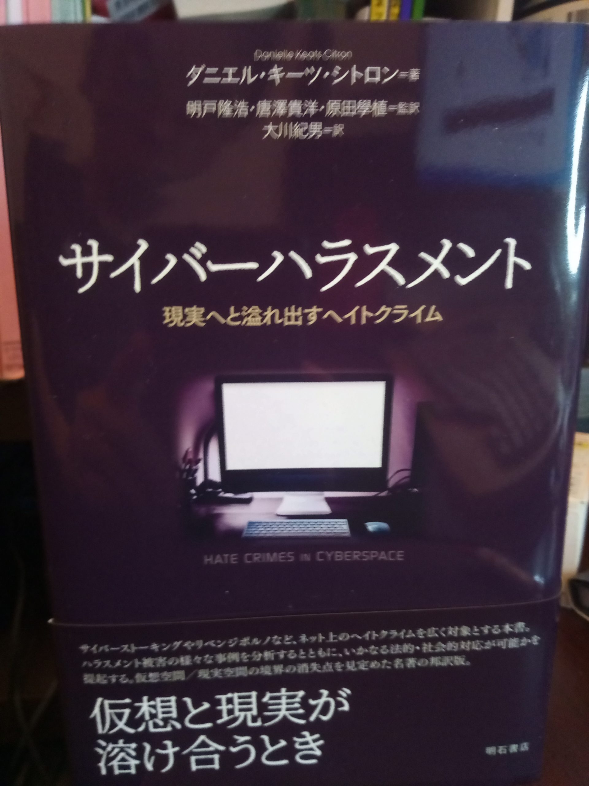 勧告の調査をお願いしている原田學植先生から、先生が、監訳した「サイバーハラスメント 現実へと溢れ出すヘイトクライム」の献本をいただきました。
