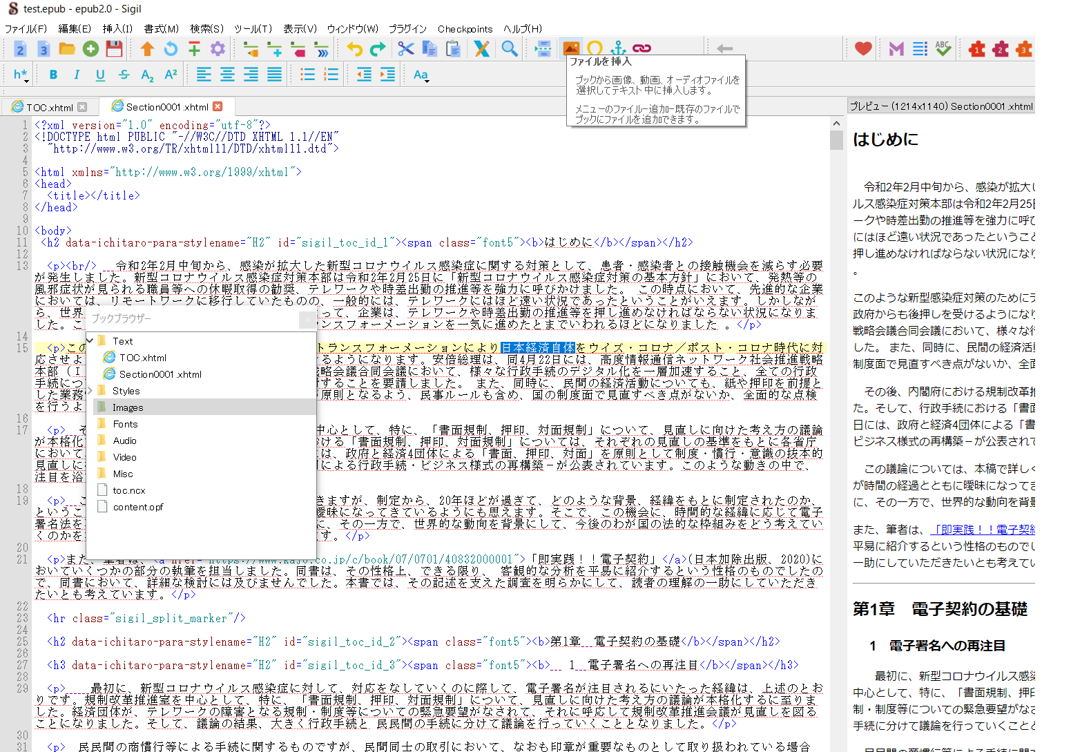 最終段階までは、Bluegriffonでhtmlソースに手をいれていきましたが、最後は、Sigilで直接、修正等をしていきました。