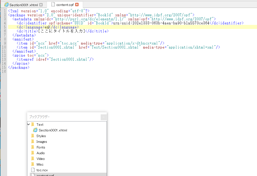 どうも、環境設定は、content.opfというファイルでおこなっているようです。で、開いてみます。言語がenになっています。