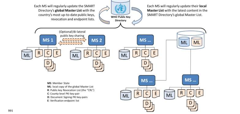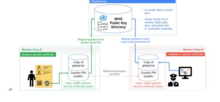 WHOの信頼フレームワークは、WHOによって管理される公開鍵ディレクトリによって運用される加盟国間の信頼の連鎖に依存している。個人の健康データがWHO公開鍵ディレクトリに保存されることはない。WHO公開鍵ディレクトリは、メンバー国の公衆衛生当局にリンクされた公開鍵のグローバル・レジストリとなる。この公開鍵のグローバル・ディレクトリは、国境を越えた SVC の検証と妥当性確認を可能にする。