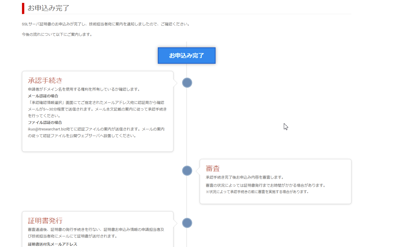 でもって、承認ページURLにアクセスして、承認します、というのをクリックすると、ものの10分ほどで、証明書が発行されました。申し込み完了の画面は、こんな感じ。