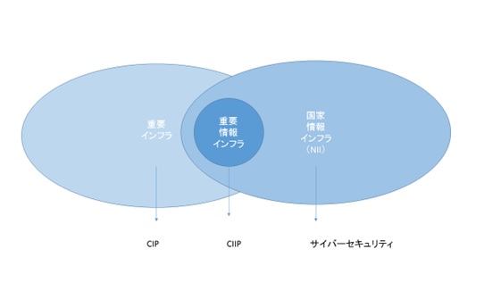 参考として、欧州の動きをみてみましょう。欧州連合では、重要インフラ防護(CIIP)、国家情報インフラ(NII)、情報重要インフラ(CII)について、それぞれの防護が発展してきているところです。詳細な経緯については、別の機会とします。概念の関係を示す図は、こんな感じです。