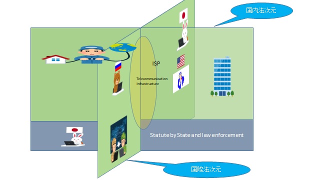 この図は、通常の重要インフラの活動は、国対国という関係とは、別個の次元 (国内法次元)で行われていることをベースにしています。しかしながら、それらの活動が、電気通信インフラというものに支えられており、かつ、その電気通信インフラが、国対国の種々の活動にとっては、格好の標的としやすい(国際法次元とも関わる)ために、結果として、重要インフラの通信サービスが、安全保障の観点から、重要な役割を果たしていることを示しています。
