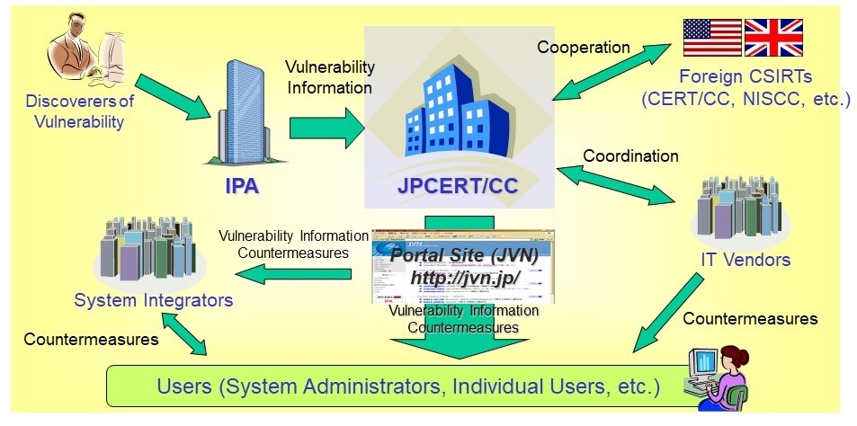 です。研究者等が発見して(左上)、IPAに届け出、そして、jPCERT/CCが調整機関として関係者の調整を図るという枠組です。