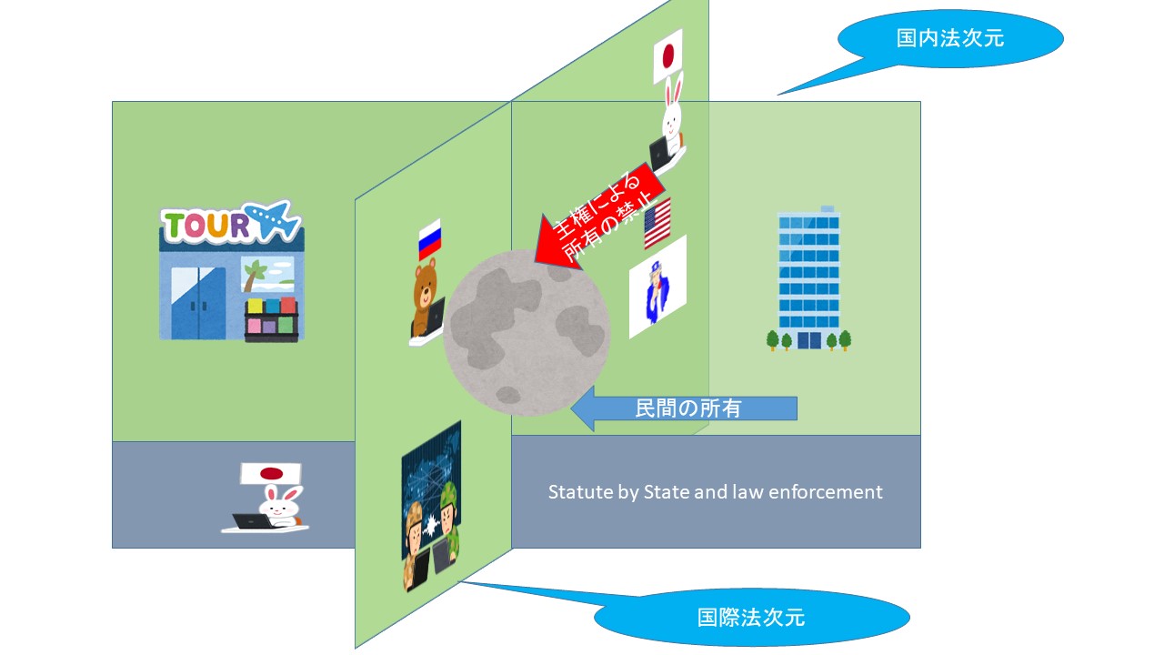との関係をどのように考えるかということです。なお、この部分に関しては、月の土地の所有権を販売するビジネスは、有効か、という議論が小塚ほか「宇宙ビジネスのための宇宙法入門」に紹介されていたりします。