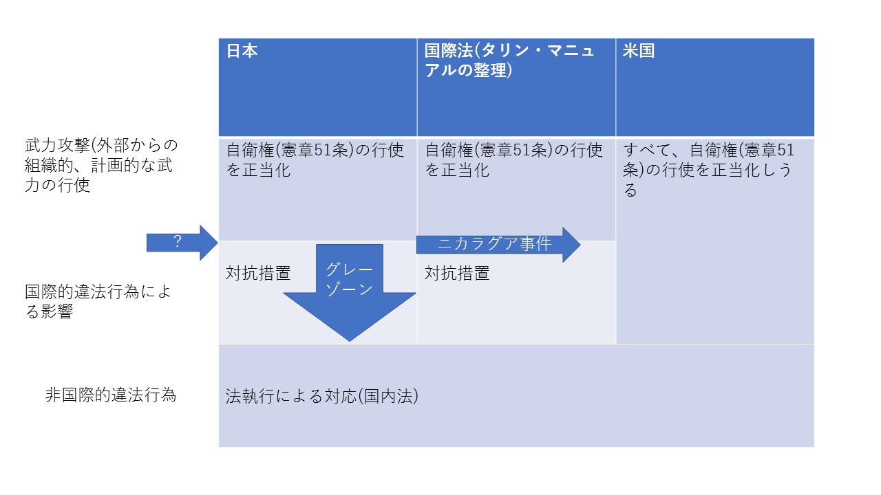 とされていることに関連して、グレイゾーンにたいしての国家の活動は、「自衛権」の行使として整理されるでのではないか、という論点があります。この論点については、私のブログでは、「サイバーにおける自衛権、武力攻撃、武力行使、対抗措置」で整理しているところです。ひさびさなので、表を出します。