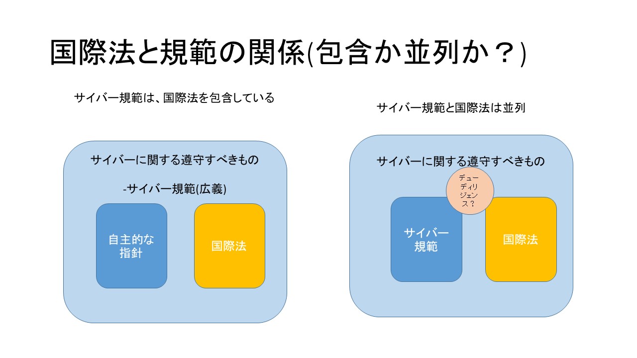 「規範」と「国際法」の関係について、明確に拘束力のあるもの->国際法、拘束力のない指針->規範 という用語法が明確になったところかと思います。逆に、この用語法について規範のところで、デューディリジェンスを論じると、違反に対して、拘束力がないのか、という批判をうけることになるわけです(英国のUN GGEへの報告書参照)。