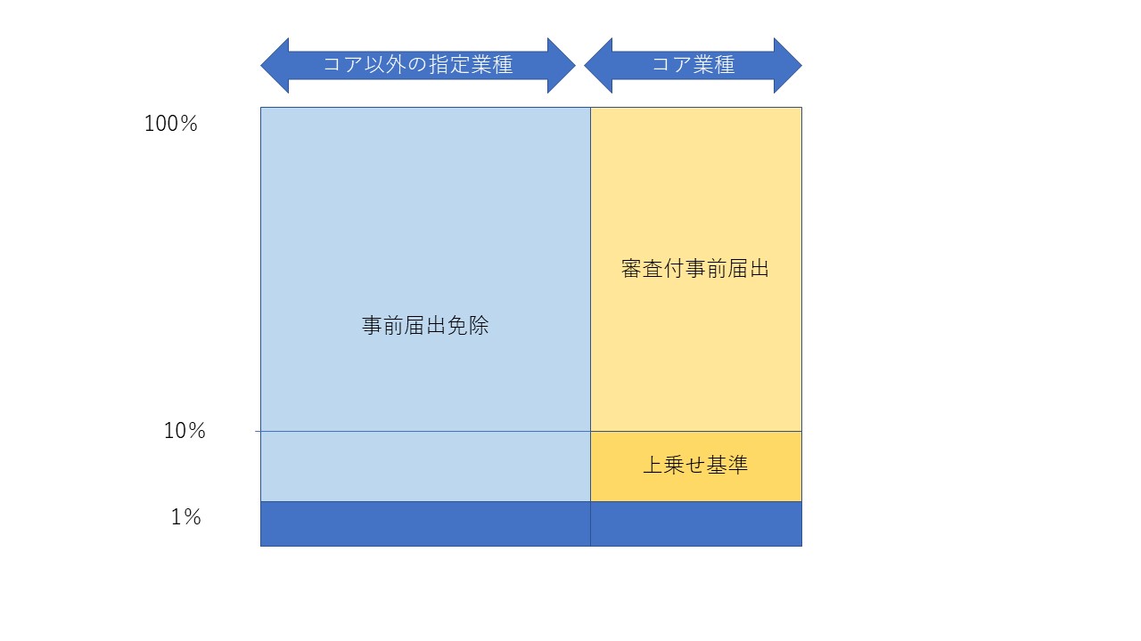 まず、最初は、事前届出が、必要になる分野には、どのようなものがあるのか、ということです。上の図で右側になります。これは、コア業種と呼ばれています(上の日銀Q&A 23)。