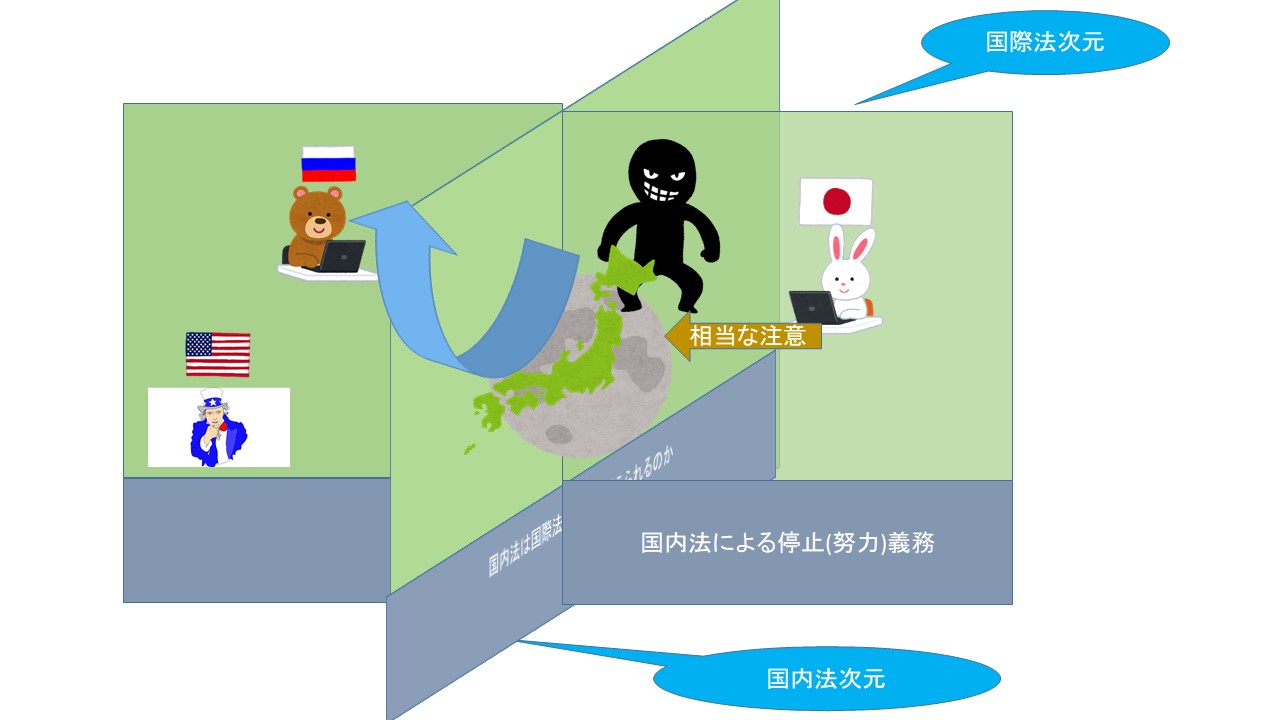 サイバーの問題については、エキスパート会合が準備されているようなので、そこで、今後、相当な注意に基づいて国内から外国のインフラに影響を与えるような行為がなされないような体制を構築するべき義務が広く認識されるようになってくるものと考えられます。