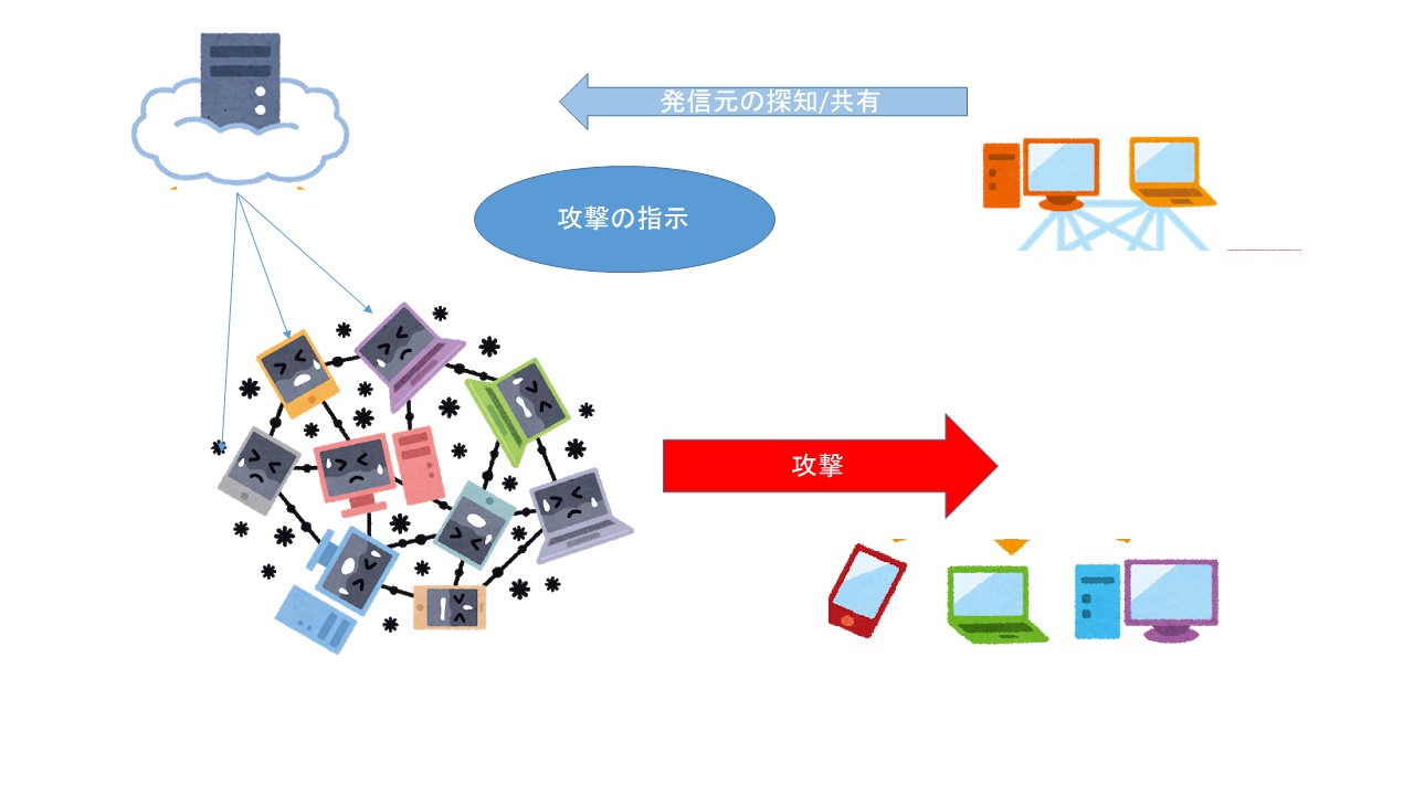 ということで、攻撃元は、(ア)で許容されるのではないのと思ったのでした。が、良く考えてみると、「指令元」という表現があります。これを図解します。すると、指令元と、ボットネットとの間の通信を遮断してしまうのに、この通信元を指定するとともに、この指令関係の通信を伝えないということを正当化する必要が出てくるわけです。