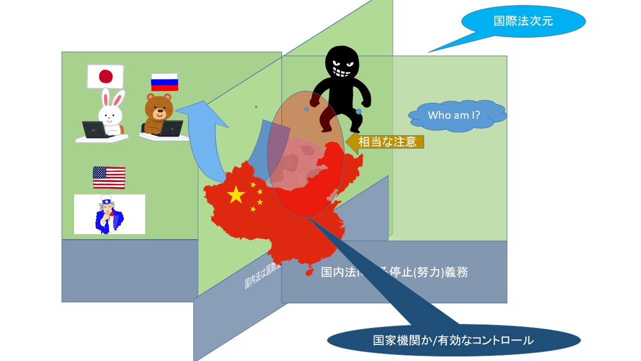 この図でわかるように、行為者を特定した場合に、その行為者が、国家機関であれば、そのまま国家責任、もし、国家機関でなければ、有効なコントロールがなされているかをみて、もし、それがない場合には、国家としての「相当な注意」と、違法行為に関与している場合の停止義務の論点になるわけです。