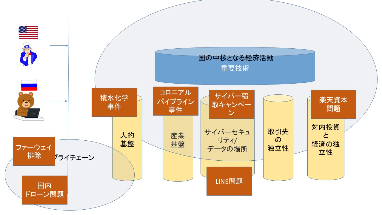 でもって、2021年にいろいろと問題になった事件を経済安全保障のリスク対応という観点からみた私の図は、こんな感じです。