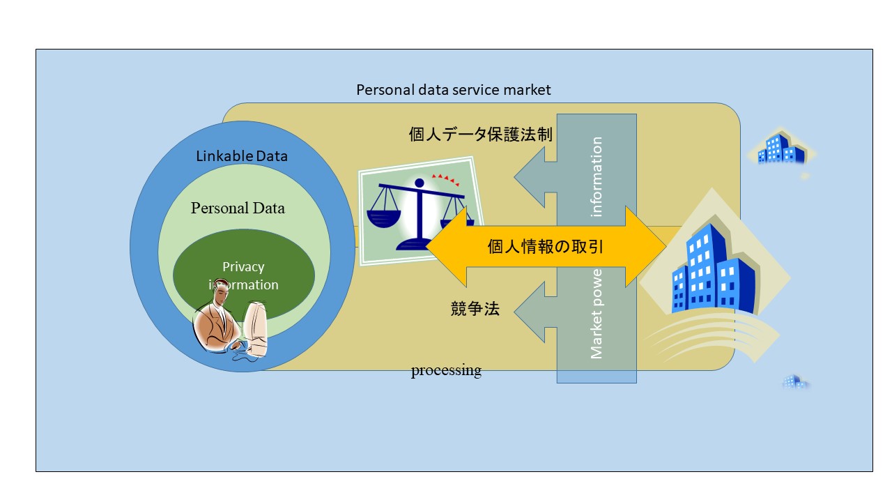 というのが全体像になります。この図は、個人データの情報主体が、ネット上で、とあるプラットフォームと個人情報を含んだ取引をしている状況を示しています。この「個人データの取引」が「公正かつ自由」であるためにクリアすべき条件があるわけです。まず、ここで、「公正かつ自由」というのを考えると、