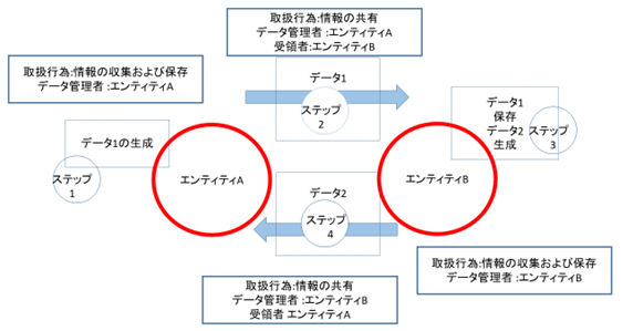 これは、情報共有においては、その取扱の段階に応じて、ダイナミックにそれぞれ管理者と取扱者が変化することを示しています。具体的には、受信の場合は、それ自体では、管理者にならないが、それを保存して、データを分析すると、データ管理者となるということです。