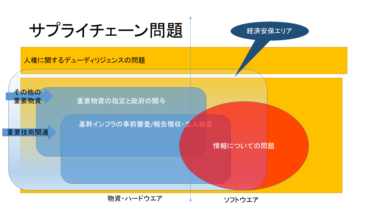 この図は、サプライチェーン問題として、人権に関する問題、それ以外の物資・ハードウエア、ソフトウエア種々の国民経済・個々のシステムセキュリティへのリスクが存在していること、経済安保のリスクとして大きく捉えることができること、また、情報に関する問題として「新しい経済安保」の問題として捉えられる問題がかなりの程度をしめていること、を示しています。