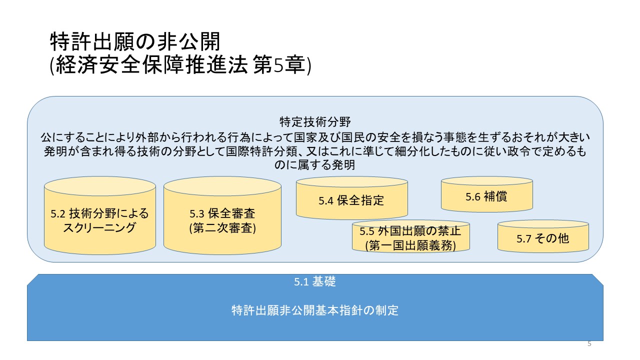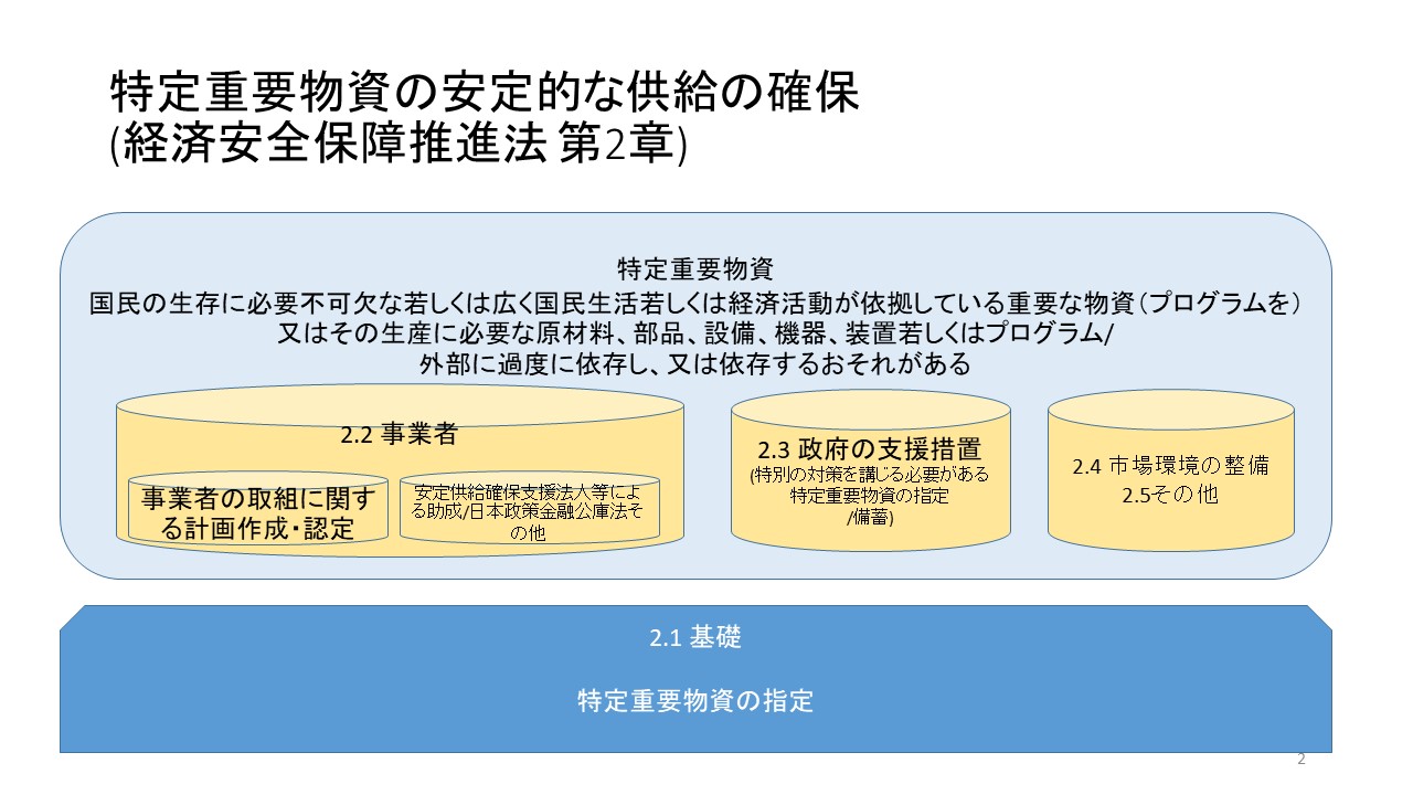 - 特定重要物資(第七条に規定する特定重要物資をいう。第六条において同じ。)の安定的な供給の確保及び特定社会基盤役務(第五十条第一項に規定する特定社会基盤役務をいう。第四十九条において同じ。)の安定的な提供の確保並びに特定重要技術(第六十一条に規定する特定重要技術をいう。第六十条において同じ。)の開発支援及び特許出願の非公開(第六十五条第一項に規定する特許出願の非公開をいう。)に関する経済施策の一体的な実施に関する基本的な事項