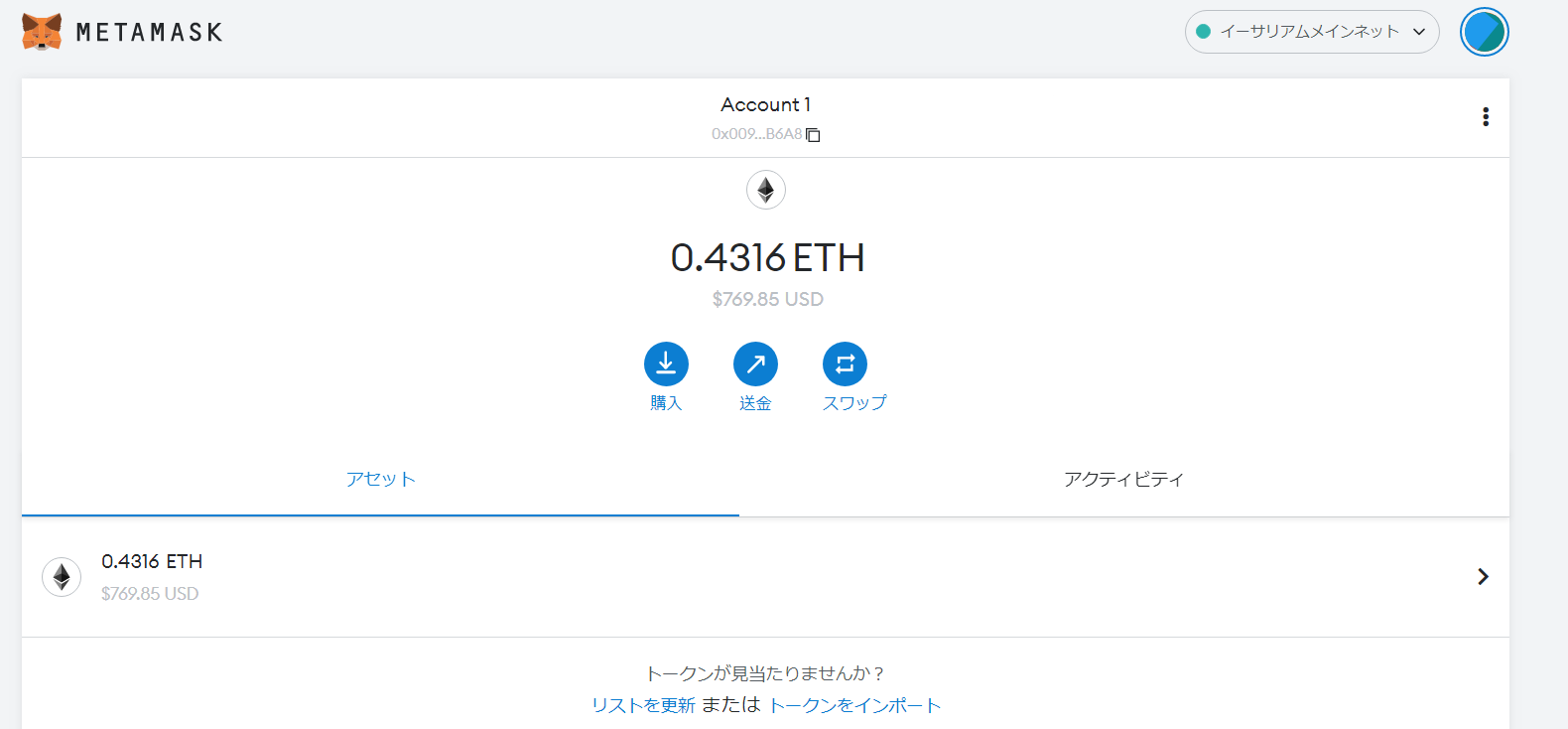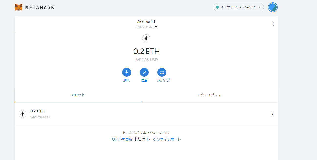 ということで、他のネットワークと接続するのに0.2イーサの費用がかかるので、最低限は、入金しておきます。