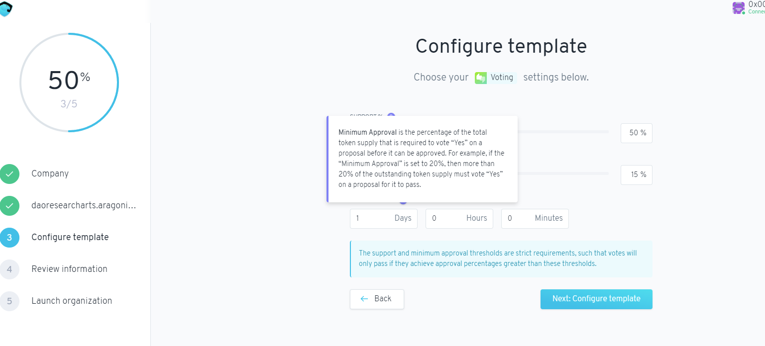 Supportは、提案が承認されるために “Yes “の投票が必要とされるトークンの相対的な割合です。例えば、「支持率」を50%に設定した場合、議案の可決には、投票に使用されたトークンの50%以上が「はい」に投票する必要があります。