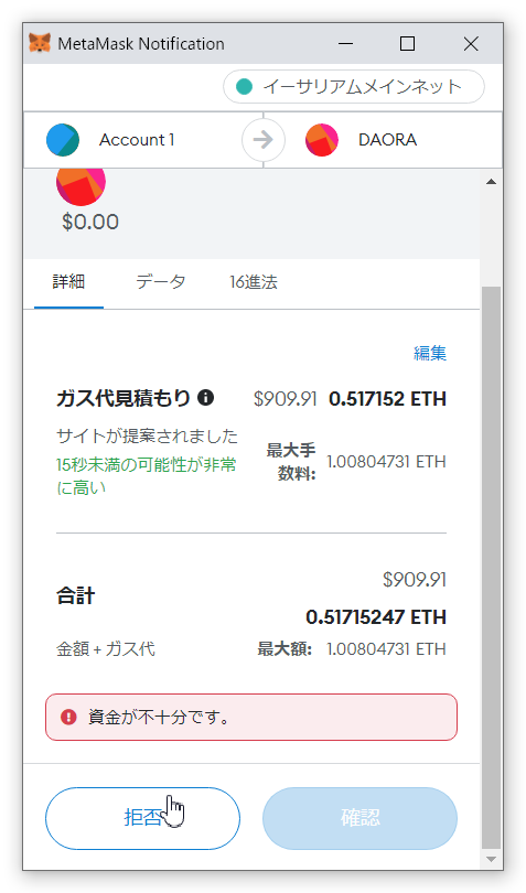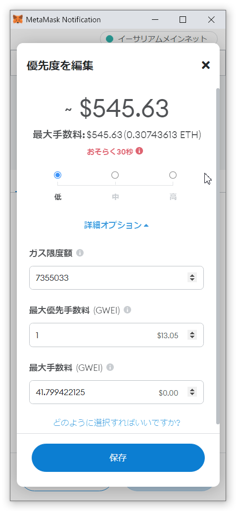 ガス代の優先度を編集すると、0.3イーサで処理ができることになりました。なので、これを保存して、この処理を承認しました。