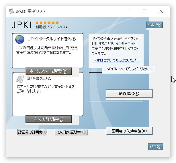 それで、JPKI利用者ソフトで、自分の証明書を見て、きちんと動くことを確認します。