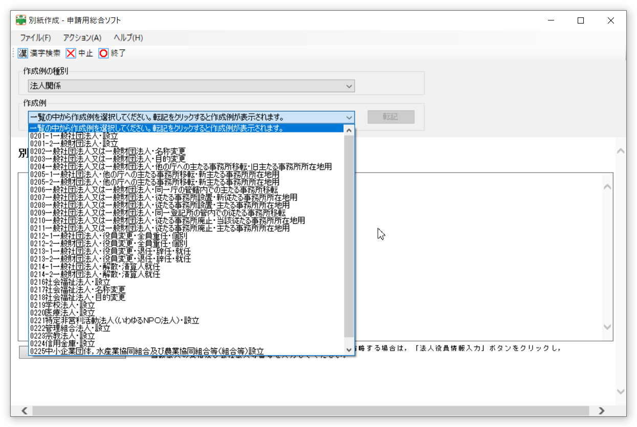 ここで、登記すべき事項については、「別紙表示」のところを選択すると、このようなドロンプダウンがでて、選択すると、例文がでてきます。それを参考に文章を作成。