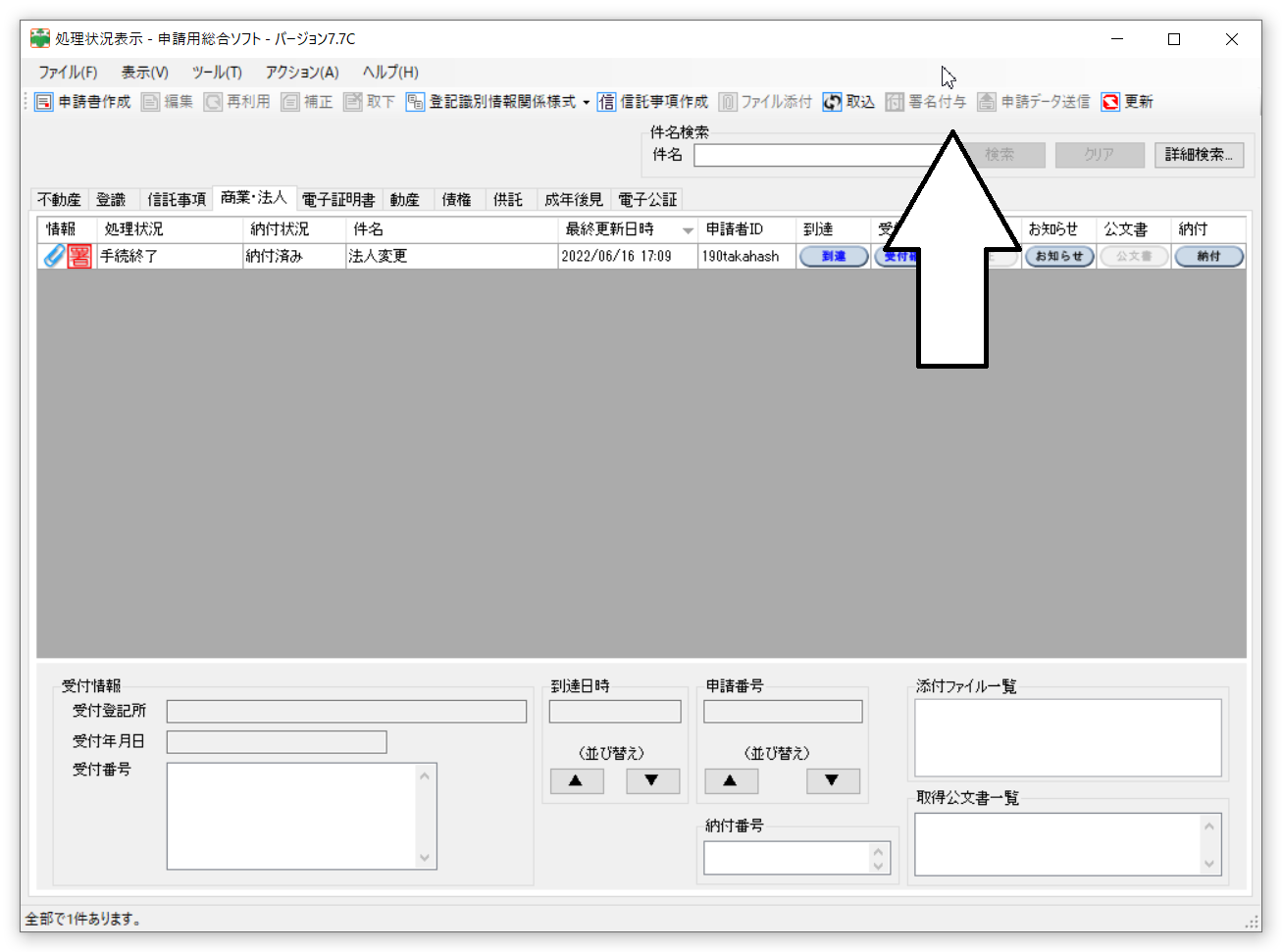 処理状況表示の画面にいって、添付書類をつけます。そして、最後に署名を付与します。