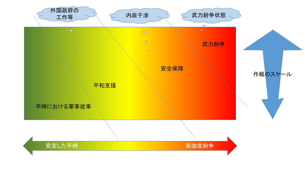 従来の議論にマッピングする場合に参考となるものに、2017年のドクトリン(AJP-01ALLIED JOINT DOCTRINEEdition E Version 1 )の紛争のスペクトラムの図(図2.1 紛争のスペクトラム)を利用してみます。