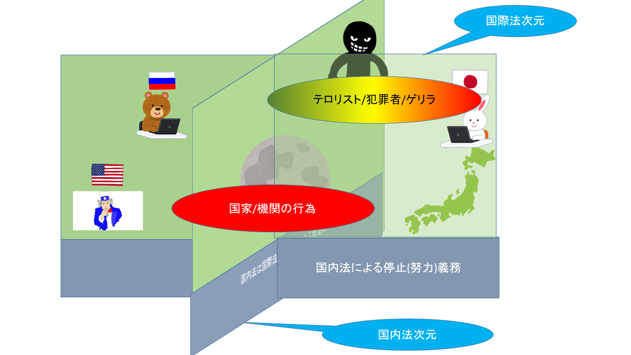 法の世界は、国家間の関係に関する国際法と国内法とにわかれます(いわば、パラレルワールドです)。これらは、それぞれの関係を論じる場合、ひとつの世界を形作っていて、どちらが優位というものではありません。しかしながら、テロリストは、国際法では、国の機関ではないので、それ自体に表に出てこないはずですが、ハイブリッド脅威としては、まさに、国際紛争の重要なプレイヤーとして表に出てくるのです。上の図で、国際法の次元のところにテロリストの黒い影がにじみ出ているイメージになります。