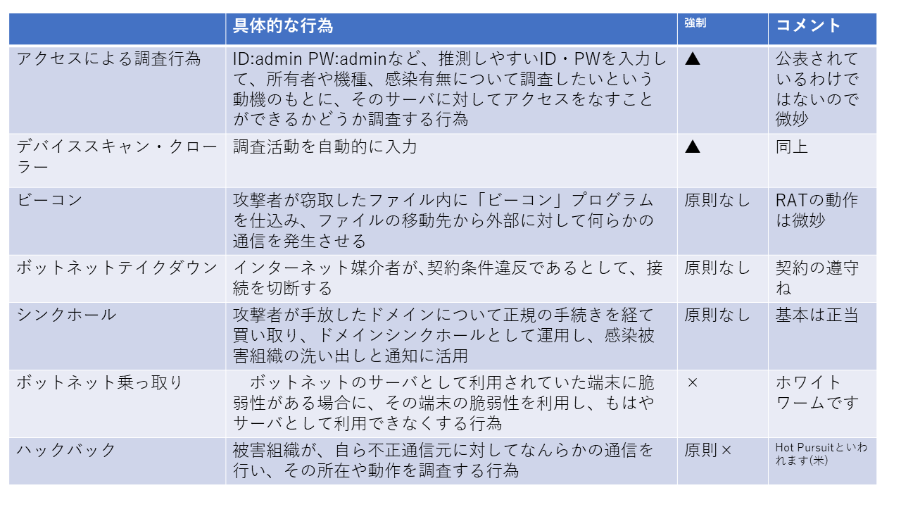 これらは、セキュリティの観点からいって、「侵害的要素をなしうる行為」であるので、それが、国が、「特定の機会」にあることを理由にして、当該セキュリティ侵害的要素をなしうるのか、というのが、「アクティブサイバー防御」という用語のメリットであると考えます。