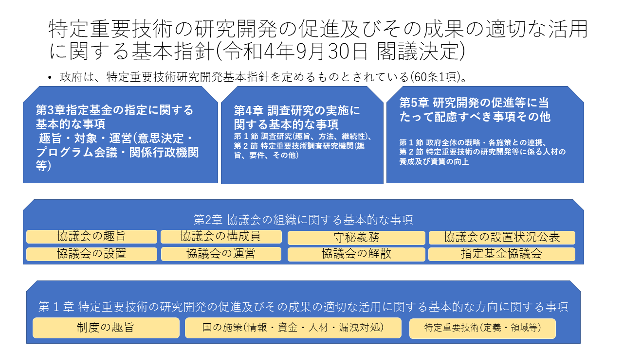特定重要技術の研究開発の促進及びその成果の適切な活用に関する基本指針 は、はじめに、第 1 章 特定重要技術の研究開発の促進及びその成果の適切な活用に関する基本的な方向に関する事項、第 2 章 協議会の組織に関する基本的な事項、第 3 章 指定基金の指定に関する基本的な事項 、第4章 調査研究の実施に関する基本的な事項 、第 5 章 特定重要技術の研究開発の促進等に当たって配慮すべき事項その他特定重要技術の研究開発の促進等に関し必要な事項からなりたっています。図示すると、このような形です。