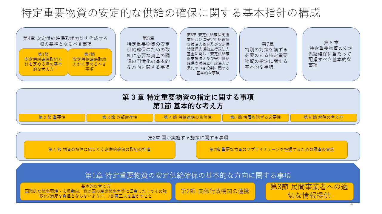この基本的な方針の構成は、はじめに、第1章 経済施策を一体的に講ずることによる安全保障の確保の推進に関する基本的な事項、第2章 4施策の一体的な実施に関する基本的な事項、第3章 安全保障の確保に関し、総合的かつ効果的に推進すべきその他の経済施策に関する基本的な事項、第4章 経済施策を一体的に講ずることによる安全保障の確保の推進に関し必要なその他の事項からできています。