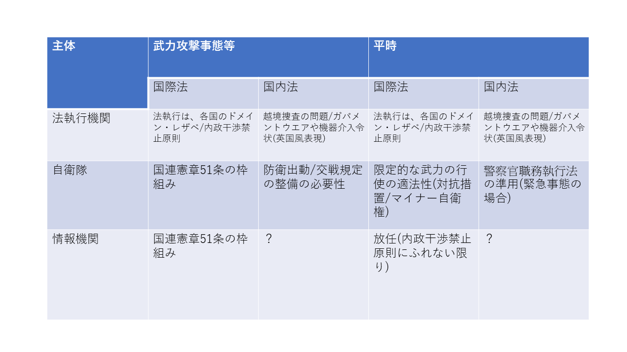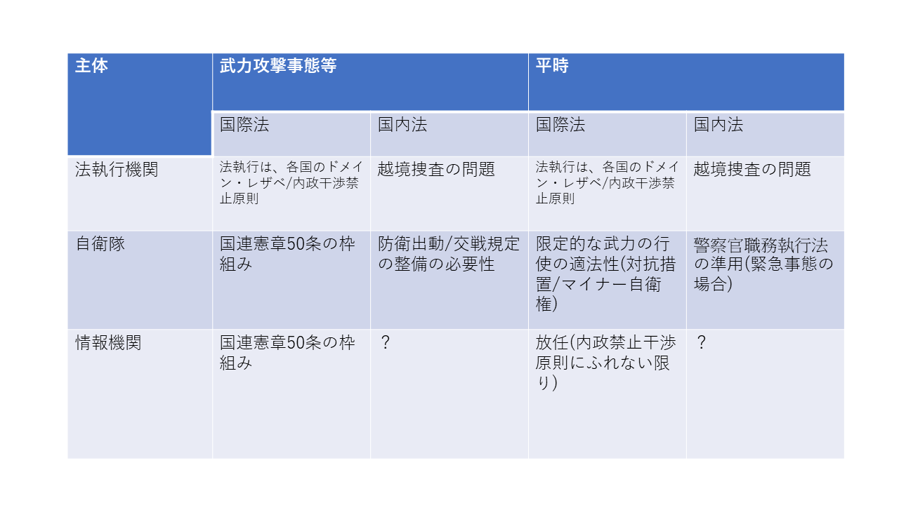 理論的には、強制力の行使がなされうるとして、攻撃行為の停止、妨害、抑止行為や証拠を取得する行為が、国内法的に、どのような根拠法に基づいてなされうるのか、という問題が生じます。