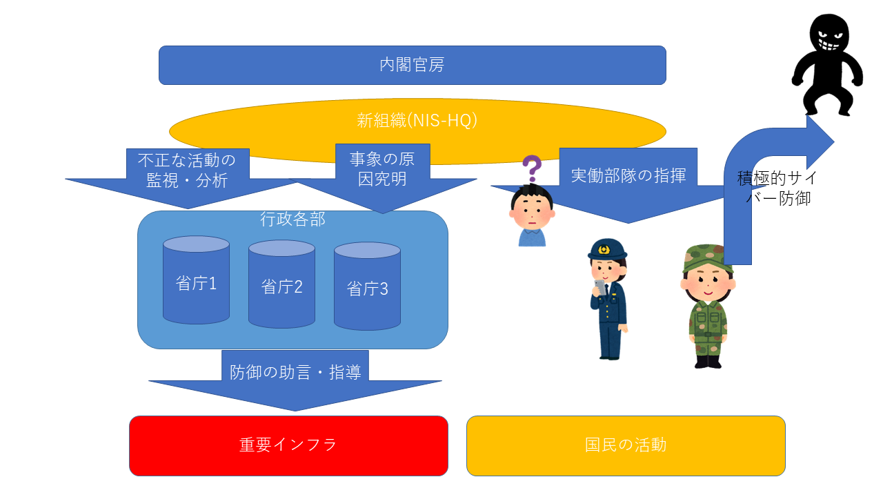 内閣サイバーセキュリティセンター(NISC)の機能を吸収し、規模や権限を拡大して対処力の強化を図る。新組織には攻撃の兆候の探知や発信元の特定を行う「積極的サイバー防御」(アクティブ・サイバー・ディフェンス)を指揮する役割も付与する方向