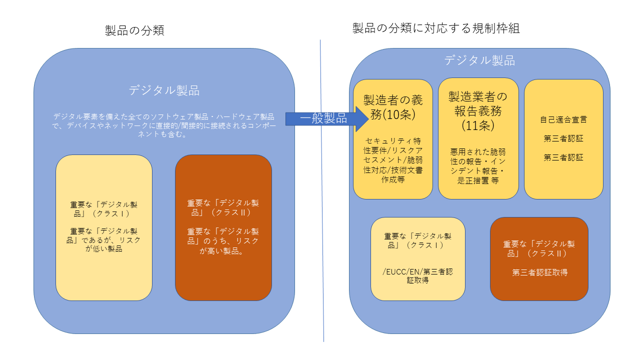 この図は、基本的な概念としてデジタル製品という概念を準備して、それに対して製造者に報告義務を含む種々の義務を課すことが考えられています。そして、そのリスクに応じて、商品についての認証制度を導入しようという制度設計になっていることを意味しています。
