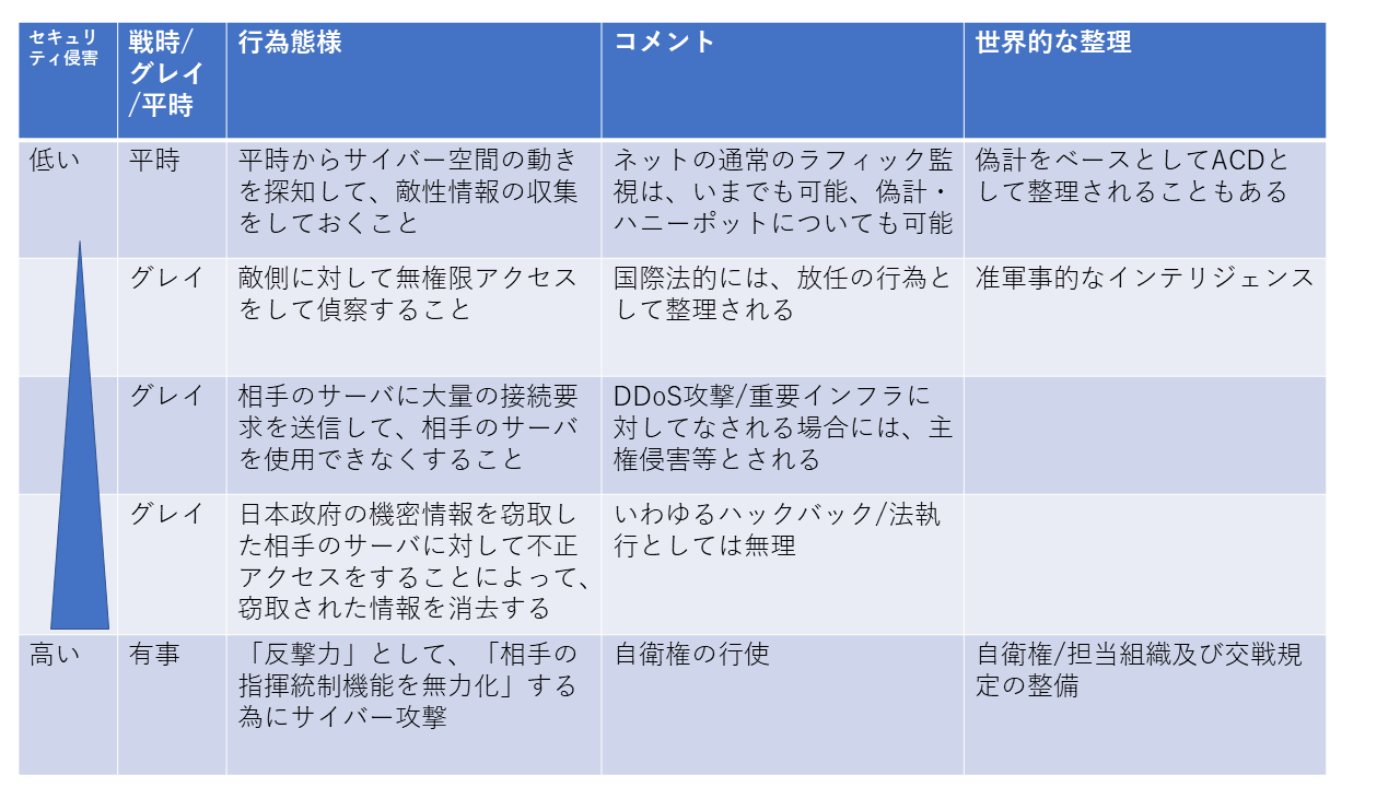 場合の議論であることがポイントです。これについては、続・アクティブサイバーディフェンスの概念(9月19日) で見ておきました。