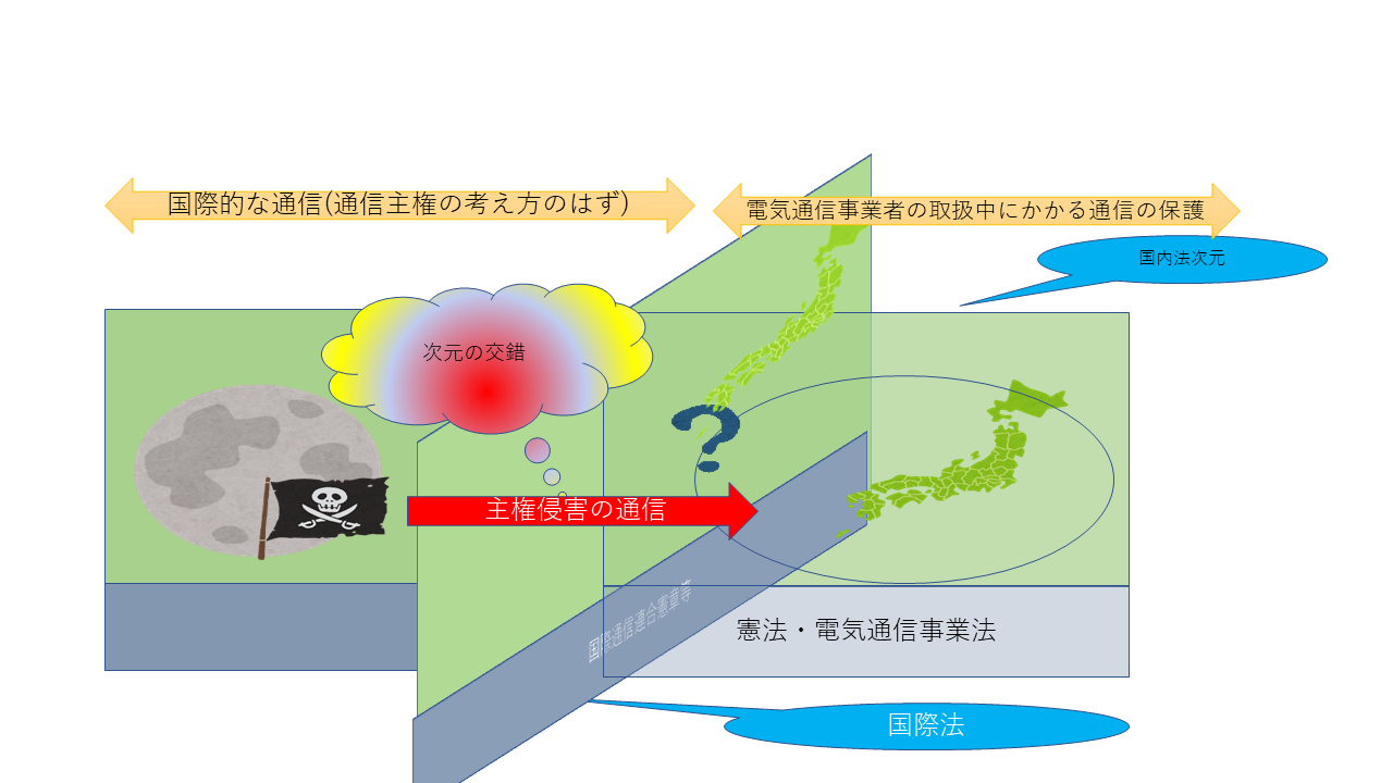 「通信の秘密」の保護は、一般的には、電気通信事業法の「秘密の保護」の解釈としてなされています。制定法上は、電気通信事業者の取扱中の通信に関する秘密の規定なので、宅内の通信は、この規定で保護されるわけではないです。それと同様に外国の通信事業者で伝達されている通信も保護されないとかんがえているのですが、その通信は国内で通信されるとなぜか国内通信と同じで保護されると解釈されているのてず。
