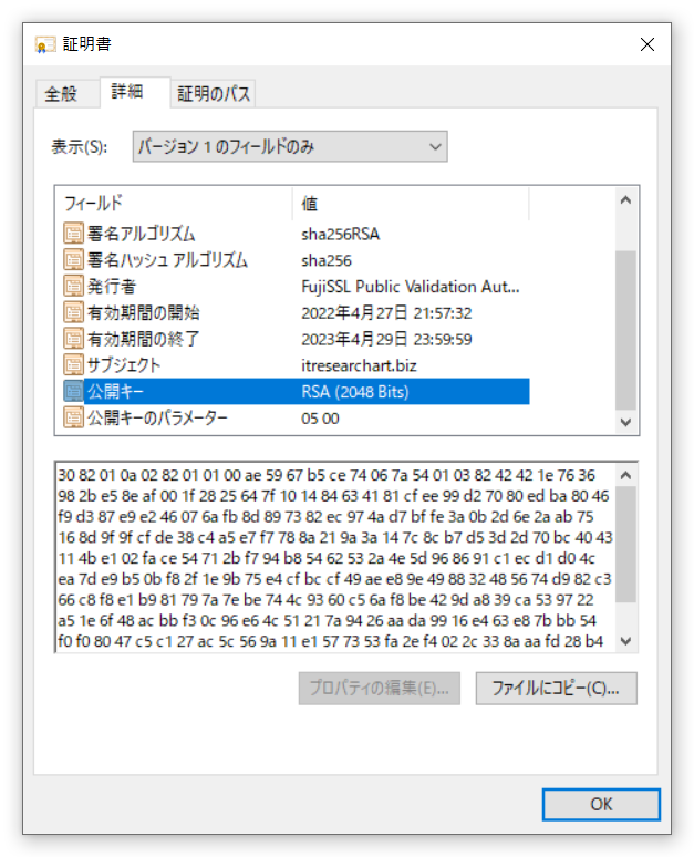 これは、上のでみた通りです。実際の証明書を操作してみるとわかりますが、このサイトの証明書において当社のサイトが、itresearchart.biz というドメインから送信されており、そのサイトの公開鍵が、以下の図でしめされているものであることかわかります。