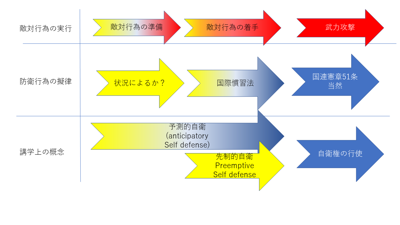 国連憲章第51条では、「武力攻撃が発生した場合」に自衛権を有するとしているが、この言葉の選択は、攻撃がまだ始まっていないことを意味しており、攻撃を受けていない主権国家に対する武力行使は、国際法上(国連安保理決議の例外を除き)適格でないとされていることになります。