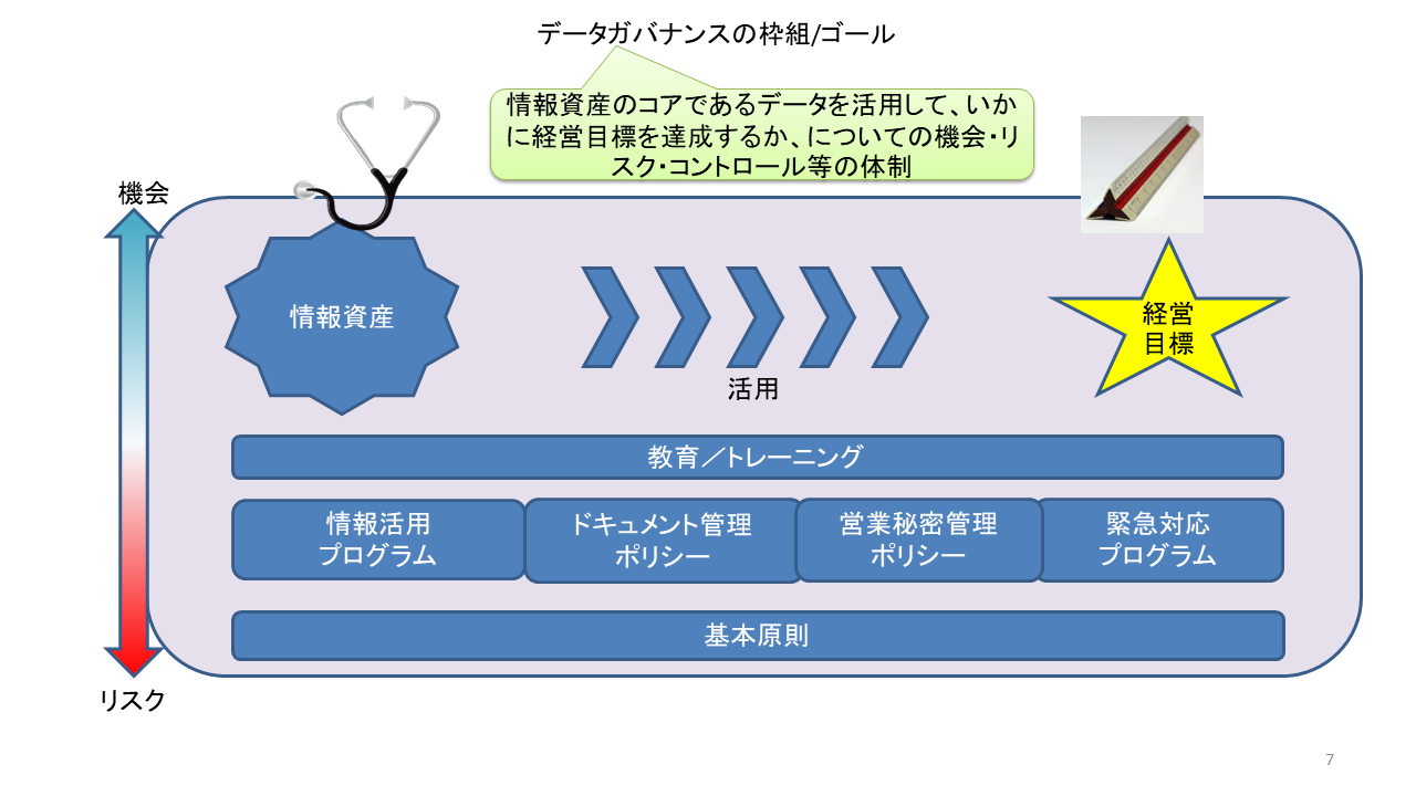 一般には、リスクというと(企業法務の場合)、企業活動にとって、マイナスの影響を与える場合のみを意味する用語法のほうが一般的ですが、この定義は、プラスの場合もあるということになります。私は、企業の情報ガバナンスを論じる場合に、