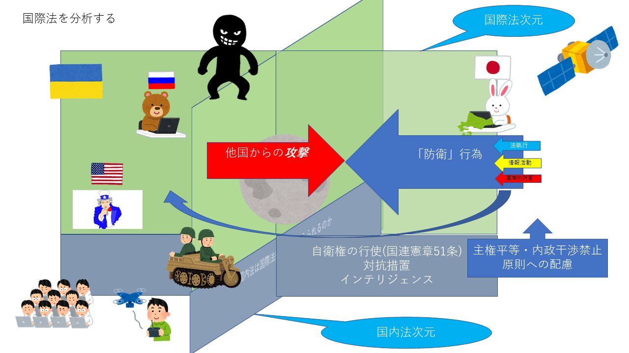 - 国際法であれば、武力行使禁止原則、対抗措置の枠組、自衛権の考え方