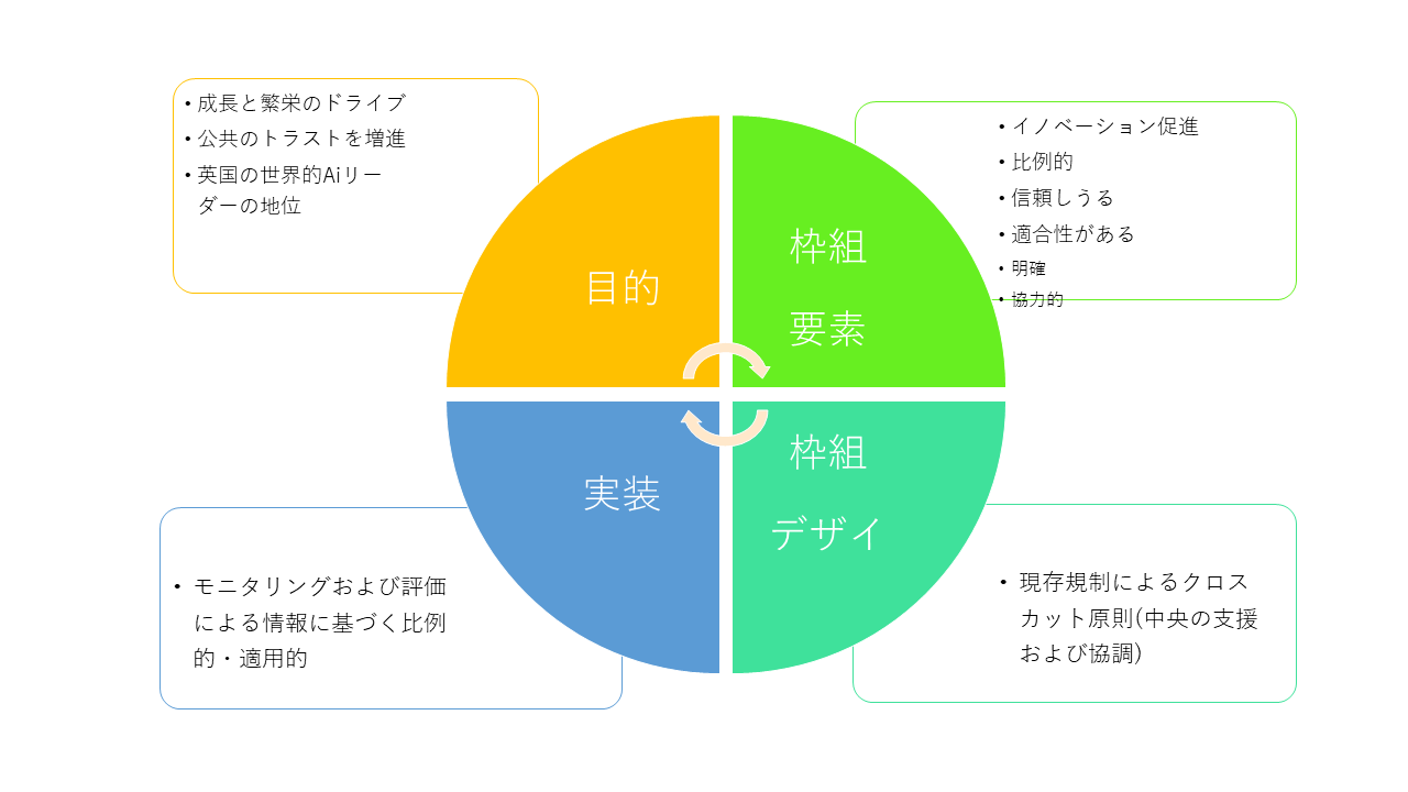 規制枠組の狙いでは、リスクに対処しつつ、重要な問題を解決するインセンティブを与えることで、イノベーションを促進することが目的であること(バラ31)、国家AI戦略の目的もそうであること(32)、その詳細は、パリシーペーパー(人工知能庁 2022)で明らかにされているが、