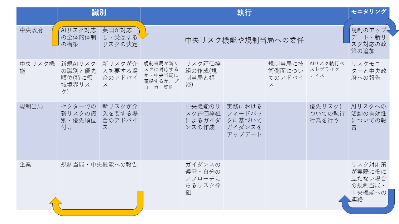 もっとも、中央での調整や監視が比較的少ない現在の規制のパッチワークが、このまま放置されればイノベーションへの障壁を増大させるとという懸念がパブコメで表明されており、政府は、枠組み全体を調整、監視、適応させるためのメカニズムを導入する意向が表明されています(70,71)。