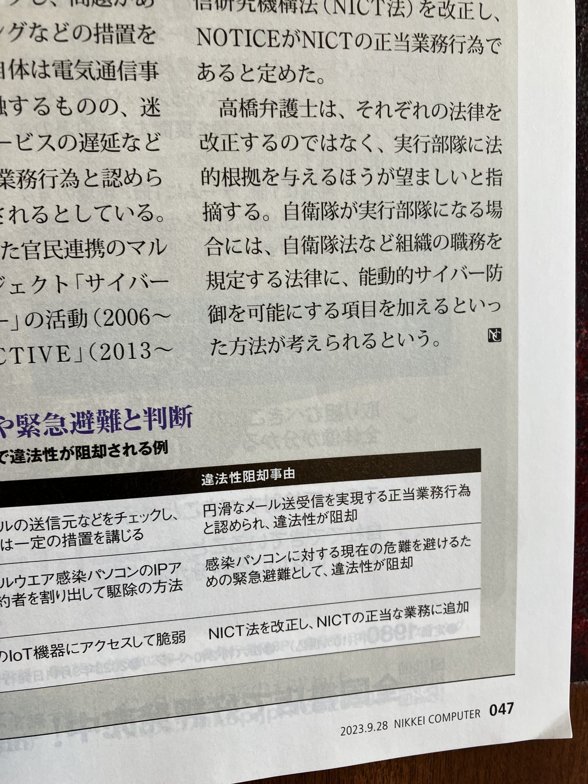 報告書・米国出張でブログを書く時間がとれませんでした。でもって、遅くなりましたが、日経コンピュータ9月28日号の「安全保障の新戦略 能動的サイバー防御」の記事にコメントが掲載されています。