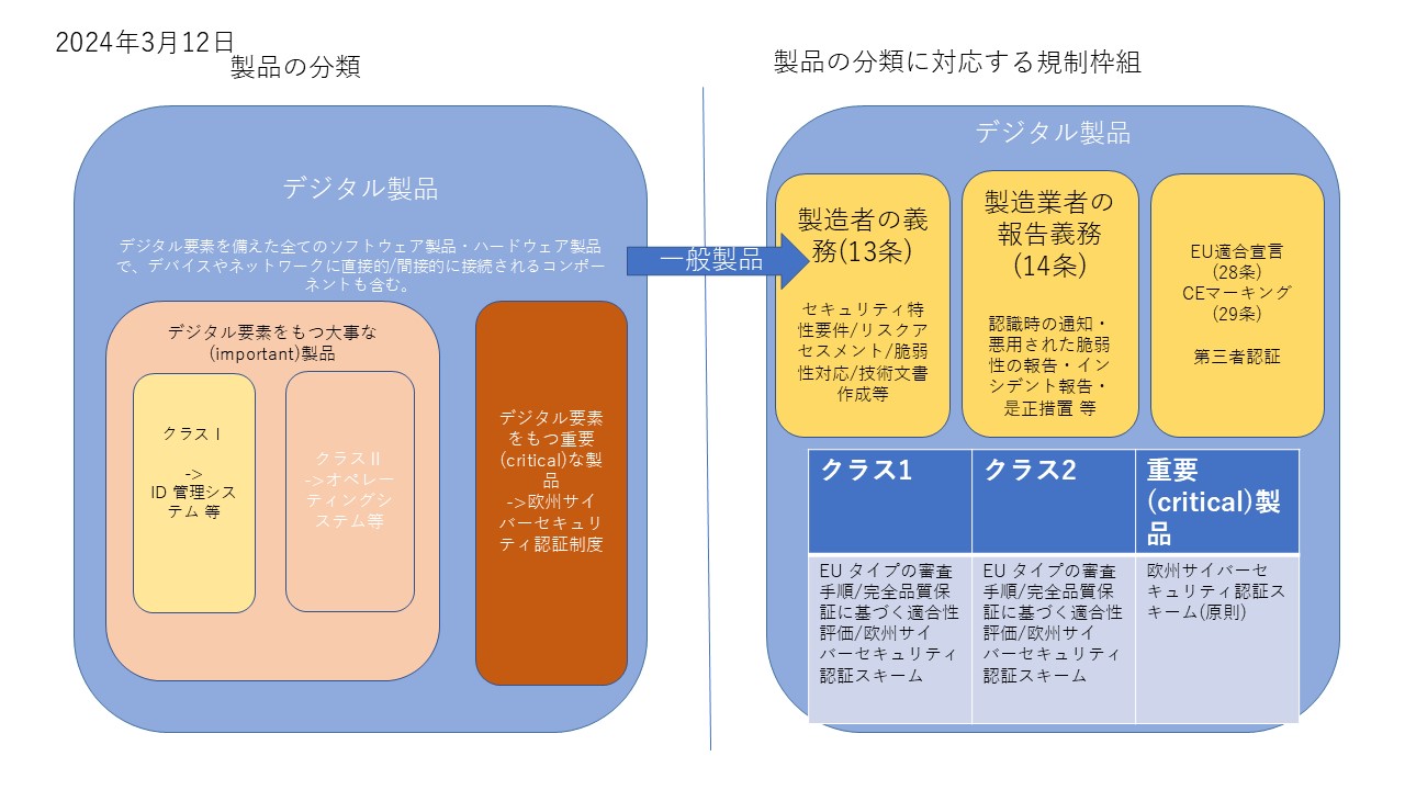 従来は、デジダル要素をもつ製品のなかに、デジタル要素をもつ重要な製品があり、それがクラスⅠおよびⅡにわかれていたところ、デジタル要素をもつ製品がさらに、大事な(important))製品と重要な(critical)な製品にわかれるようになりました。大事な(important))製品がさらにクラスⅠおよびⅡにわかれています。