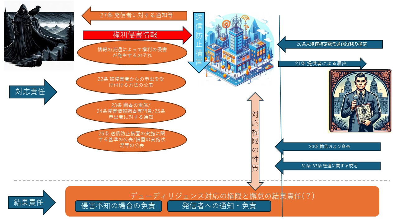 (コメント)配給者責任をもとに考えるとき、本来は、侵害情報送信防止措置を講ずるよう申出があった場合、これを怠れば、配給者は、法的な結果責任を負うべきものとなるはずです。それに対して、そのような結果責任によるインセンティブが効きにくいことから、むしろ、法的な(対応)義務として定めているということになります。もっとも、23条については、28条の透明性措置の対象にはなっていますが、これに対して、報告の徴収(29条)、勧告および命令(30条)の対象になるものではないです。