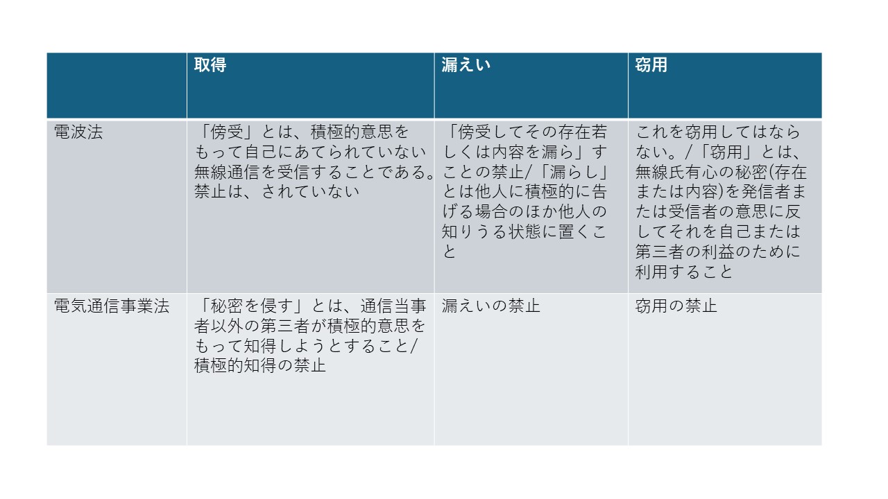 - 秘密の保護との関係で、無線通信の秘密の窃用には、特定の対象との通信の要件に該当はしないと思われるが、明確ではない