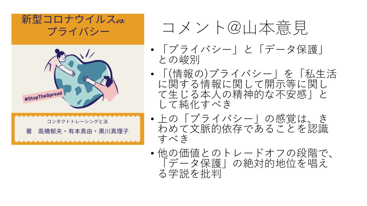 私としては、「プライバシー」論は悪であるとは、一回もいっていないので、その点は、山本先生に私の立場がきちんと伝わっていないと考えています。この点については、2020年6月の段階で、「山本龍彦先生の「情報自己決定権の現代的な課題」でブログをとりあけていただきました」 (2020年ブログといいます)でもふれているところです。