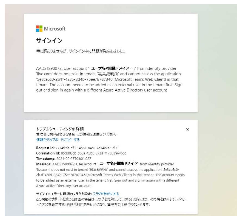 これは #ext#という表示で示される外部アカウントが、登録されていないことをしめすかと思います。でもって、Teams のサポートを検索すると、