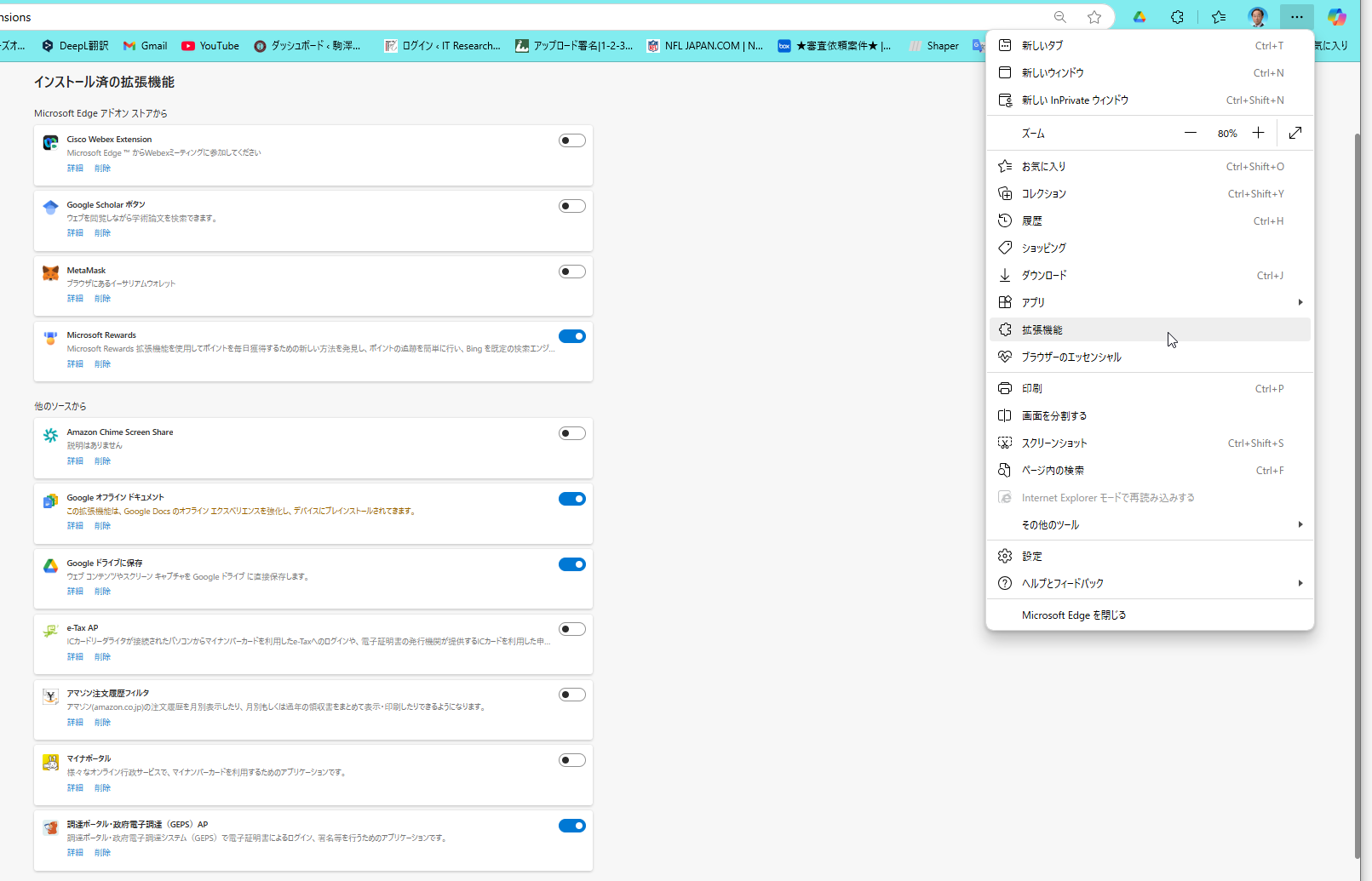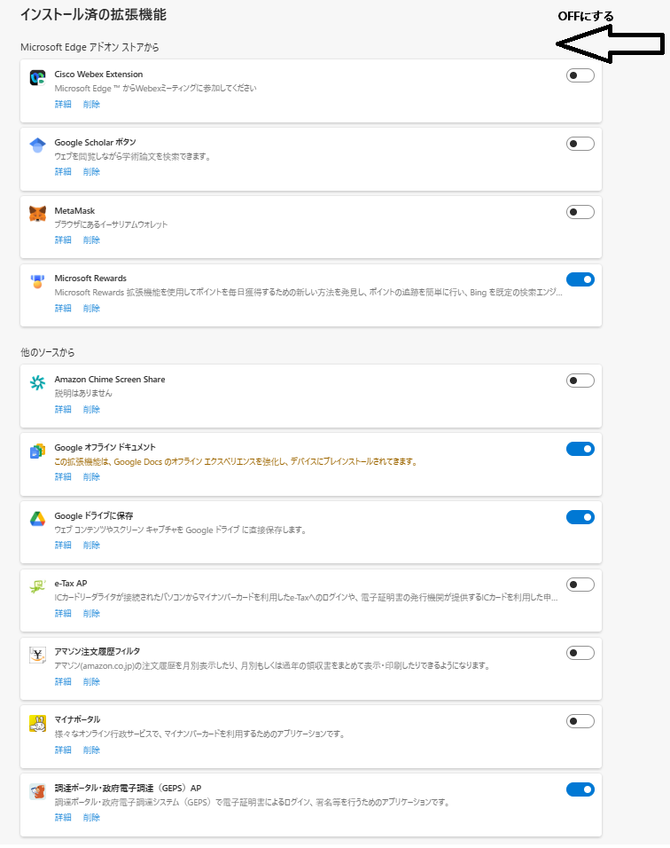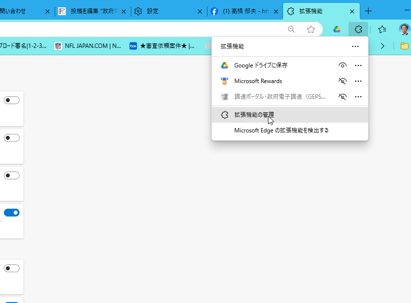 でもって、そのあとに指示された解決策は、拡張機能について、拡張機能の管理を開いてもらって、インストール済の拡張機能から、「調達ポータル・政府電子調達(GEPS)AP 」以外をすべて停止してください、ということでした。